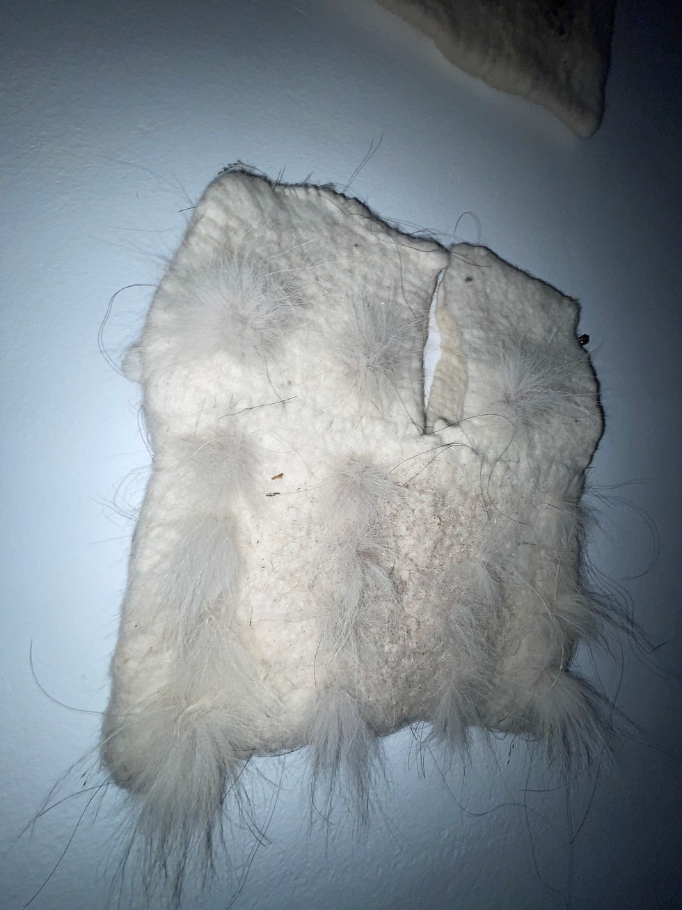 Chamomile tea bag innards - White sheep wool - Black horse mane - Cedar wood shavings - found furs - white horse tail. 36 x 33 cm