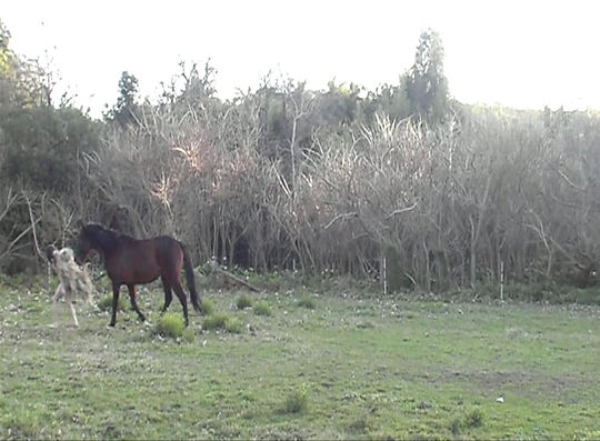 Immediately upon fitting hay shoulders to the human body, an invocation is in play. The recording exhibits playful trickery. Hay is bound to iron armature, summons horse to feed.